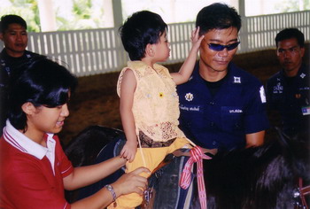 6.ปฏิบัติช่วยเหลือสังคมในโครงการ "การใช้ม้าบำบัดเด็กพิเศษ" การใช้ม้าช่วยบำบัดเด็กพิเศษจะช่วยกระตุ้นพัฒนาการเคลื่อนไหว